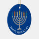 Create Your Own Hanukkah Menorah Ceramic Ornament. Menorah with nine candles and star of David on a blue festival of lights background on the front and back of the ornament. Happy holiday greetings and name of the family on the back. Place your own text, as desired.