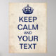 Create your own personal "Keep Calm and Carry On" poster! This version has dark blue crown and text on a vintage paper background.