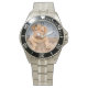 Has heft and feel of expensive stainless steel quartz watches. Good band with safety catch. I removed links, which is easy because engraved arrows show direction to push the linking pins. As always by this seller, the image (a railroad logo) is a perfect reproduction of my emailed image, and is precisely spaced and aligned.