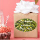 Create a beautiful oval sticker using this colorful Croton leaf background. Change the text and customize the design to ensure full sticker coverage if you change the sticker shape.