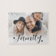 The bottom of the puzzle features a soft white gradient with the word “Family” in elegant black script, accented with small black hearts for a warm, personal touch. The simple photo layout keeps the design clean and classic while the rest of the puzzle remains plain around the edges. It makes a thoughtful gift for Mother’s Day, Father’s Day, Christmas, to remember a fun family vacation, or any moment you want to celebrate with something personal and meaningful.