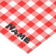 Bright red and white gingham pattern tablecloth with a personalized label so you can collect your creation after that special community event.