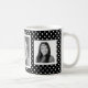Upload your own square cropped photos to create a personalized photo mug. Works great with instagram photos, just download the ones you like using a program such as instaport! Black and white polkadotted background, with three square white framed photos. Looks great with b&w or color photographs.