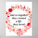 Beautiful tapestry with the words "And so together they created a life they love", and holding hands, surrounded by a wreath of flowers.