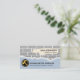 A grey brick wall with a cut-off area houses your prestigious name and job title. Just below in the blue plaster wall lies a gold hammer logo you can use, alongside the business name and its contact details.