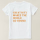 Tshirt for creatives features the text 'creativity makes the world go round' in bold orange typography. Print on front and back. Exclusively designed for you by Happy Dolphin Studio. If you need any help or matching products, please contact us through our store chat!