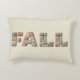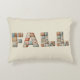 A cozy decorative pillow featuring the word “FALL” spelled out in bold faux quilted patchwork letters. Each letter is made of different fabric patterns in warm autumn tones like orange, brown, teal, and cream, creating a rustic farmhouse and seasonal feel.