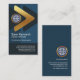 Over at the top left wall lies a gold globe logo you can use. Below this are your prestigious name, job title and a slogan to publicize your services. In the dark blue column near the base, you have the business name and contact details.