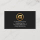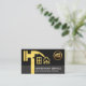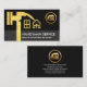 A black and grey layered cover features a creative gold home hammer landscape design. The sun shining above is a gold landscape logo you can use. Towards the base of the card lies the business name and its contact details.