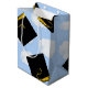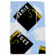 Cool graduation gift bag featuring black and gold graduation caps flying against a puffy clouds background. To customize edit text to add his or her name and senior class year.