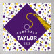 Creative graduation party poster, featuring purple cap with a gold tassel on confetti background. To personalize, edit text add grad's name and senior class year.