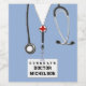 Unique medical school graduation gift label or party decoration, featuring blue hospital scrubs. Edit text to add name of doctor.