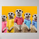 Creative Meerkat Group in Bright Fashionable Outfits. This creative animal concept features a group of meerkats dressed in vibrant, fashionable outfits. Set against a solid background.