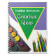 Creative ideas and creative thoughts notebook which has a border of paints and pencils as a background. Add your name or the name of the intended recipient. Green, purple and yellow colour theme.