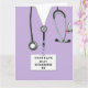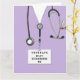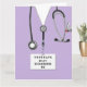 Unique nursing school graduation cards featuring creative lavender hospital scrubs, a stethoscope, and funny Swiss Army knife illustration. Edit text to add nurse's name.