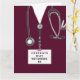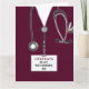 Unique nurse graduation congrats card featuring maroon hospital scrubs, a stethoscope, and funny Swiss Army knife illustration. Edit text to add nurse's name.