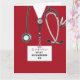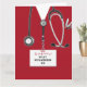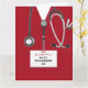 Unique nursing school graduation card featuring red hospital scrubs, a stethoscope, and funny Swiss Army knife. To personalize edit text to add nurse's name.