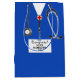 Unique nurse graduation gift bag featuring royal blue hospital scrubs, stethoscope and a big congrats. Edit text to add name of nursing school grad.