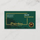 A simple professional design. In an emerald green cover there is a light yellow rectangular box that holds all your details. This box is stylishly adjoined to the word "painter" which is cut in half at the bottom. To accentuate this area, there is a dark green paint splash at the background. Below this painter signage is your slogan option. You can change this to suit your design. Eastwards to this is a faux gold logo of the alphabet-P and a home which you may use. Alphabet-P can mean "Painter", "Painting" etc. Moving upwards in the cut-off area of the box lies your prestigious name in dual tones. One part of your name is white whilst the other is a light brown. Contact details are on the opposite end at the left side of the wall.