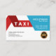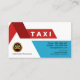 Overleaf, a similar design theme is used. The service type option of "TAXI" is at the top whilst the contact details and another slogan tagline option is at a blue trapezium near the base of the card. Eastwards, is the faux gold logo once again with its business name.