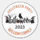 Happy Halloween cool black typography concept design where letters are made with halloween symbols images. Orange and yellow abstract background. Customizable text halloween sticker template.