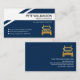 Over at the top corner are your prestigious name and job title with a slogan caption just below in the blue layer. Use this caption to publicize your services. This is followed by a faux gold semi truck logo you can use. Contact details are located in their respective white buttons near the base of the card.