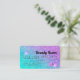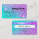 An elegant modern, stylish beauty Hair and makeup artist credit card style business card with a modern script font typography on a chic purple turquoise ombre glitter mermaid trendy background. all text is customizable, add your social media. Add your logo, your monogram and QR code.