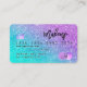 An elegant modern, stylish Hair and makeup artist credit card style business card with a modern script font typography on a chic purple turquoise ombre glitter mermaid trendy background. all text is customizable, add your social media. Add your logo, your monogram and QR code.