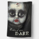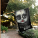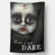 For your Halloween Haunted House, this design cautions all to "Enter if you DARE". The design features a creepy Victorian goth porcelain doll face on both sides. She has large piercing eyes and spots of blood from pin pricks to her forehead. The black background adds to the frightful night time scene that could be from a haunted house or dark cemetery. It's also a cool idea to hang this flag out when you're having friends over to watch your favorite horror movies. Imagine all the possibilities!