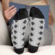This awesome pair of patterned crew socks features a creepy owl with huge bulging eyes and twisted claws. Its body is black and its wings, ears and claws and beak are grey. This creepy owl can hide unseen under the cover of darkness and is the stuff of nightmares.