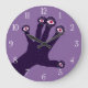 Creepy hand clock with a weird digital illustration of a dark palm with fingers ending in eyeballs with pink irises and white eyelashes watching you over purple background.