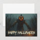 A sinister pumpkin-headed scarecrow lurks in a foggy cornfield, holding a glowing lantern. This chilling Halloween artwork captures the eerie thrill of the spooky season, blending darkness and festive fright perfectly.
