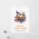 Watercolor Halloween card featuring a spooky pumpkin and colorful autumn leaves. Easily personalize this custom Halloween card with your family name and text.