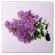 A cluster of vibrant purple flowers on a crepe myrtle bush with delicate petals is set against a soft, pale background. The arrangement is complemented by dark green leaves, adding contrast and depth.