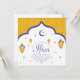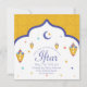 Invitation to Iftar or Eid Celebrations for Ramadan in shades of gold, blue, and white. This bright and colorful design has the outline of a mosque, a gold Arabic pattern, crescent moon and stars and fanous lanterns.