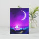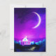 Large crescent shrouded in pink and purple clouds in the night blue sky. There is a small tiny house down among the trees on the bank of the dark river. Digital Illustration has vivid pink, violet and purple colors and shadowy mood
