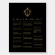 The alphabetical seating chart is for a wedding with black and gold color. In the upper part, there is a crest with a monogram in it, from the 2 initials of the bride and groom, separated by a thin line. The vintage crest is faux gold foil. The text is golden, on 3 columns. The background is black.