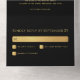 A vintage, elegant and unusual black and gold wedding invitation with a monogram in a vintage faux gold crest on both sides of the fold and a detachable RSVP with faux gold foil squares. The text is golden (except an M). The background is black.