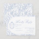 Light delft blue floral RSVP response card, designed in a refined blend of chinoiserie and French toile de Jouy style. The soft botanical illustrations frame an arched layout featuring an elegant wedding crest monogram, perfect for couples who love vintage, historic, and European-inspired aesthetics. Classic script typography pairs beautifully with the ceramic-blue palette, making this design an effortless nod to the tradition of “something blue.” Fully customizable with your RSVP date, guest name and menu choice, it’s an exquisite choice for any romantic or sophisticated wedding theme.