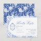 Delft blue floral RSVP response card, designed in a refined blend of chinoiserie and French toile de Jouy style. The soft botanical illustrations frame an arched layout featuring an elegant wedding crest monogram, perfect for couples who love vintage, historic, and European-inspired aesthetics. Classic script typography pairs beautifully with the ceramic-blue palette, making this design an effortless nod to the tradition of “something blue.” Fully customizable with your RSVP date, guest name and menu choice, it’s an exquisite choice for any romantic or sophisticated wedding theme.
