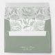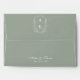 Sage Green Monogram Crest Wedding Envelope: Vintage-inspired line art monogram crest in white with elegant sage green background. Features a chinoiserie floral pattern on the inside for timeless sophistication. Elegant script font for a formal and classic style.
