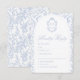 Soft Delft blue floral RSVP response card, designed in a refined blend of chinoiserie and French toile de Jouy style. The soft botanical illustrations frame an arched layout featuring an elegant wedding crest monogram, perfect for couples who love vintage, historic, and European-inspired aesthetics. Classic script typography pairs beautifully with the ceramic-blue palette, making this design an effortless nod to the tradition of “something blue.” Fully customizable with your RSVP date, guest name and menu choice, it’s an exquisite choice for any romantic or sophisticated wedding theme.