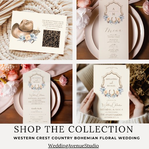 Simplify your wedding planning while embracing rustic charm and bohemian allure with our Crest Western Country Bohemian Floral Wedding All-in-One Invitation. This comprehensive invitation effortlessly combines Western country aesthetics with vibrant bohemian florals, offering a complete solution for announcing your special day.