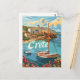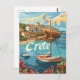 A vibrant and nostalgic depiction of Crete, Greece's largest island, celebrated for its diverse landscapes and rich cultural heritage. The design features the island's dramatic coastline, with crystal-clear waters and golden beaches, ancient ruins like the Palace of Knossos, and charming villages such as Chania and Rethymnon. Rendered in a vintage style, the artwork captures the island's timeless beauty and inviting atmosphere, inviting viewers to explore its historical sites and natural splendor