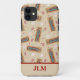 Add monogram initials or a name to create a personalized phone case that's perfect for cribbage fans. This phone case features a pattern of illustrations of cribbage game boards, playing cards, and game pegs in red, white, blue and tan set against a light tan background.
