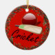 Cricket bat and ball (labeled) on vibrant red background with Christmas wreath.