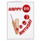 This design has an illustration of a cricket bat, wickets and ball. The ball has been hit for six. The design can be customised with a cricket loving child's birthday age and name. A personalised cricket design for kids birthday parties.