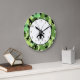 This whimsical wall clock design features a pattern of black crickets set against abstract green flowers along with a single cricket motif and green numerals set against a white circle. In some cultures, these insects are thought to bring good luck.