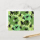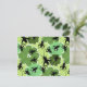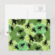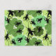 The design on this postcard features a pattern of black crickets set against abstract green flowers. In some cultures, these insects are thought to bring good luck.
