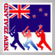 Three Silhouetted cricket players in front of the New Zealand Flag with the country name New Zealand on the side.